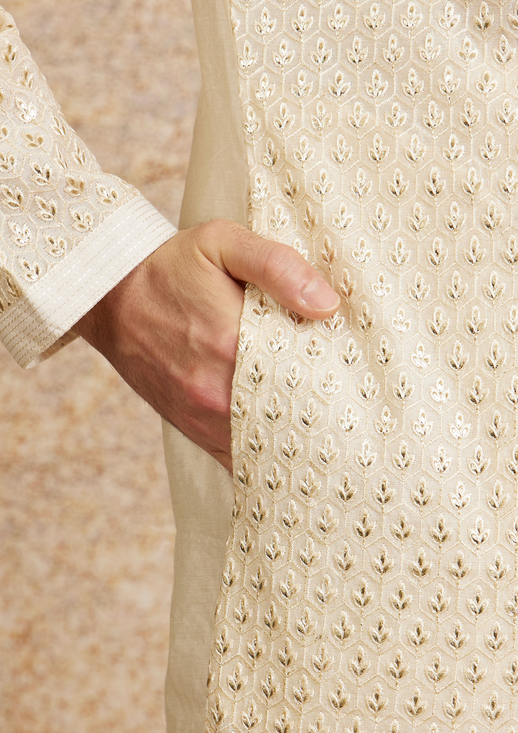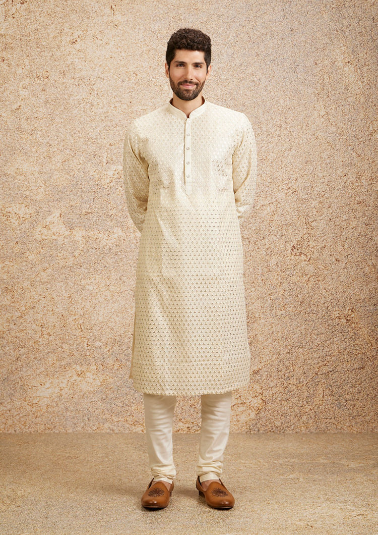 • Description This cream kurta set features charming fern buta motifs, creating a lively and natural aesthetic. The kurta is accentuated with a bandhgala neckline, a concealed placket with silver buttons making it a stylish choice for traditional and contemporary settings. Perfect for festive occasions or casual gatherings, complement this kurta set with a gold bracelet and brown sandals to highlight its unique pattern and vibrant color.