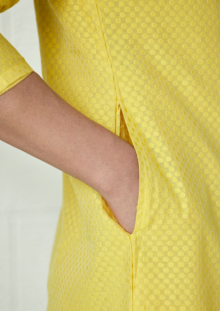 • Description Be the joie de vivre at springtime festivities in this delightful yellow kurta - off-white churidar set. Its blended cotton fabric with a jaal-like self jacquard pattern, make it well-suited for the pleasant breezy albeit sunlit days. The concealed tich button closure short placket and bandhgala trimmed with fine zari thread work relay a touch of splendour to the effortless outfit. Team it with a pair of brown sandals and a leather-strap watch, and you’re ready to step out in style!