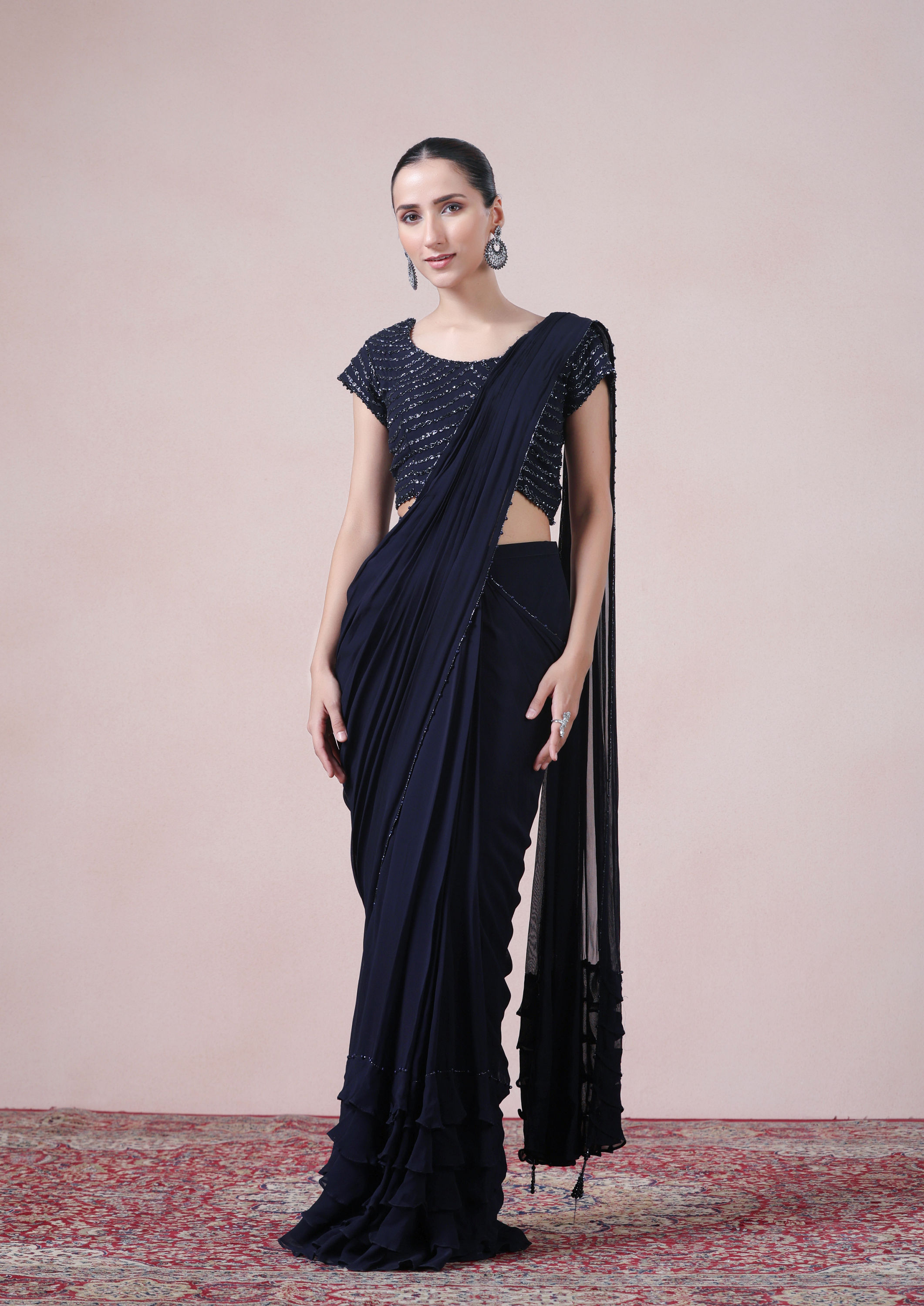 • Description The saree features enchanting ruffles at its hem, adding a touch of playful elegance. The magic unfolds in the round neck blouse, adorned with hand-embroidered cut dana and sequins work, creating a mesmerizing play of light. The georgette fabric drapes with fluidity, enhancing the graceful movement. Pair this ensemble with sparkling silver jewelry and high heels for an extra dose of allure.