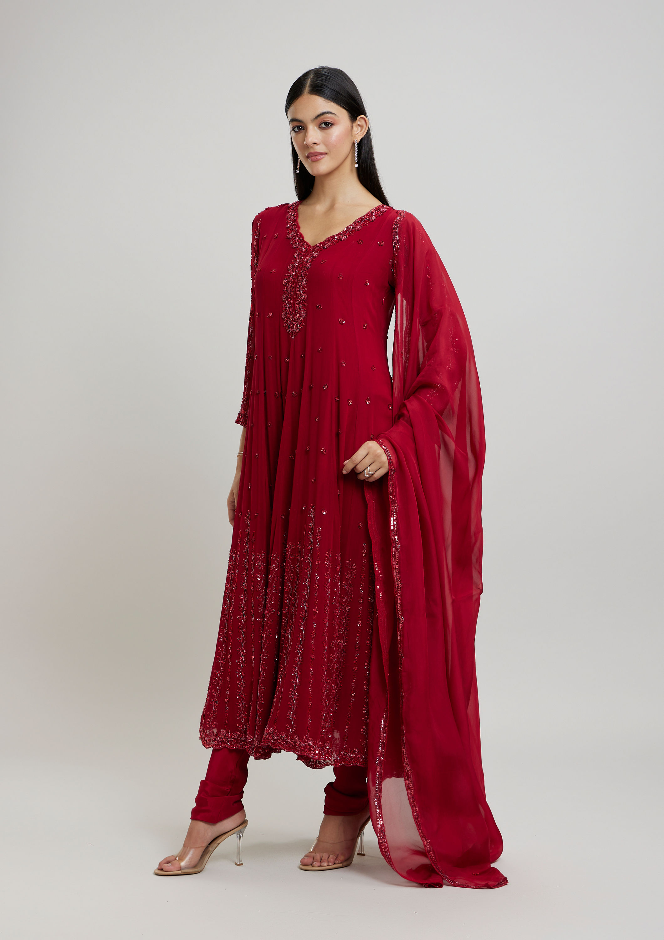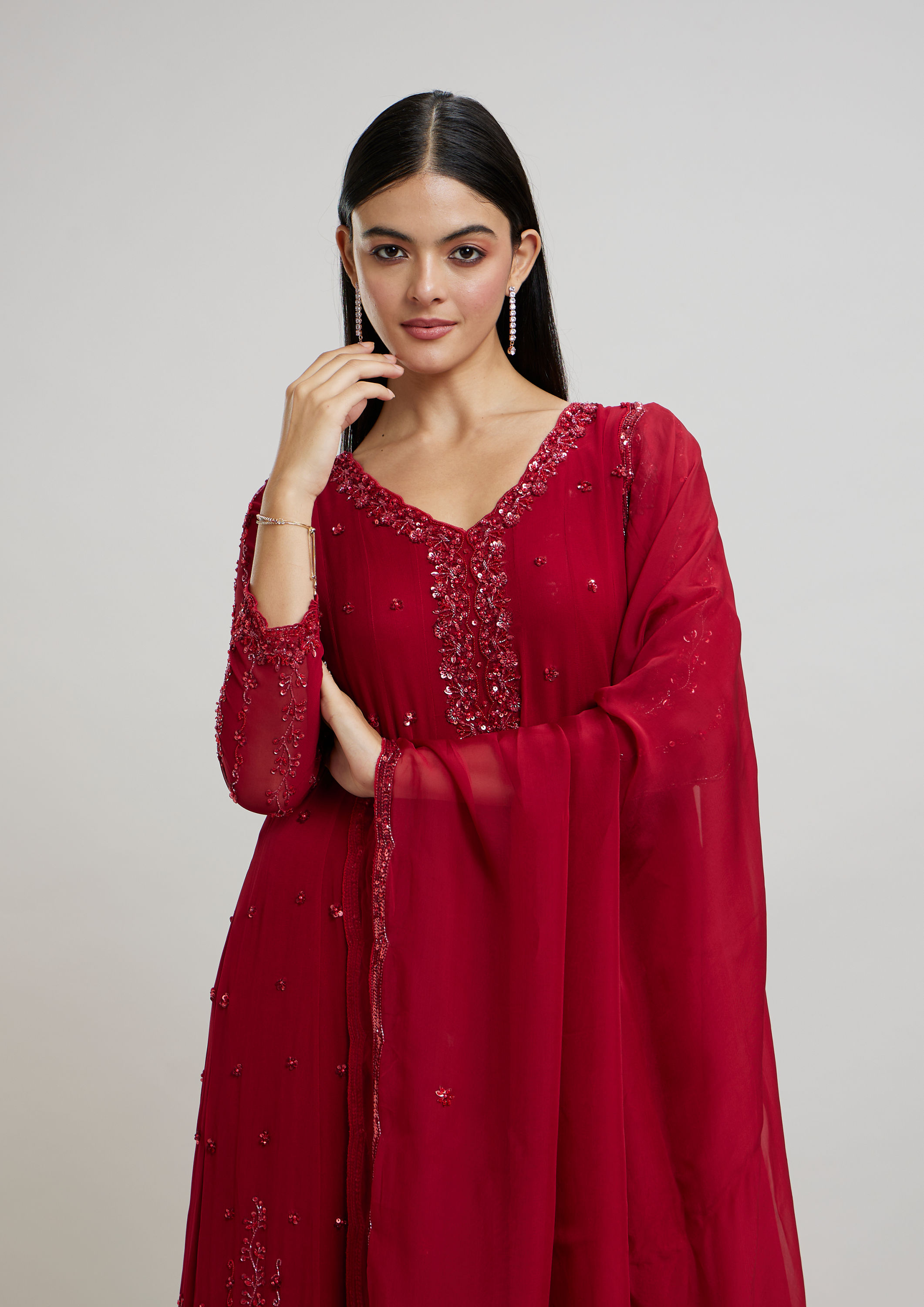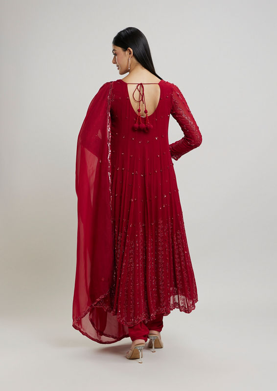 Don this Elegant Rani Pink Stitched Suit to ace the ethereal look. The magnificent georgette ensemble, comprising of an Anarkali, Churidar & Dupatta, is perfect for any festive occasion or ceremony. Exude a royal charm like never before!